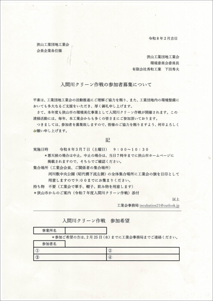 お世話様です。 標記、入間川クリーン作戦のご案内です。 昨年同様に団体募集は行いません、個人募集先着100名程度です。 詳しくは、環境委員会、工業会事務局へお願い致します 。