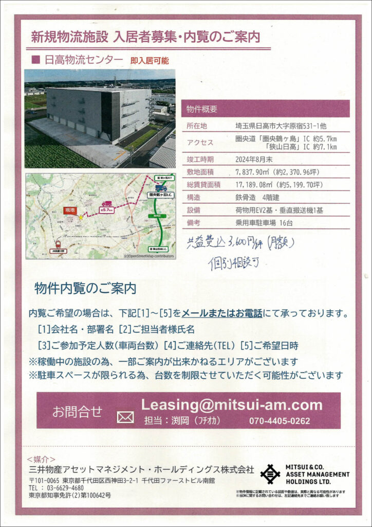事務局からのお知らせ 新規物流施設 入居者募集・内覧のご案内 2025.12.26 各位、お世話になります。 標記、日高物流センター倉庫のご案内です。 興味のある会員様、ご一読願います。 狭山工業団地工業会事務局 松本 前へ 次へ