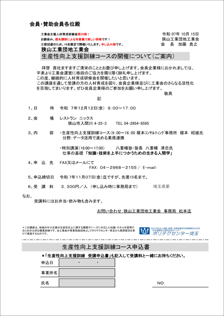 生産性向上支援訓練コースの開催のご案内